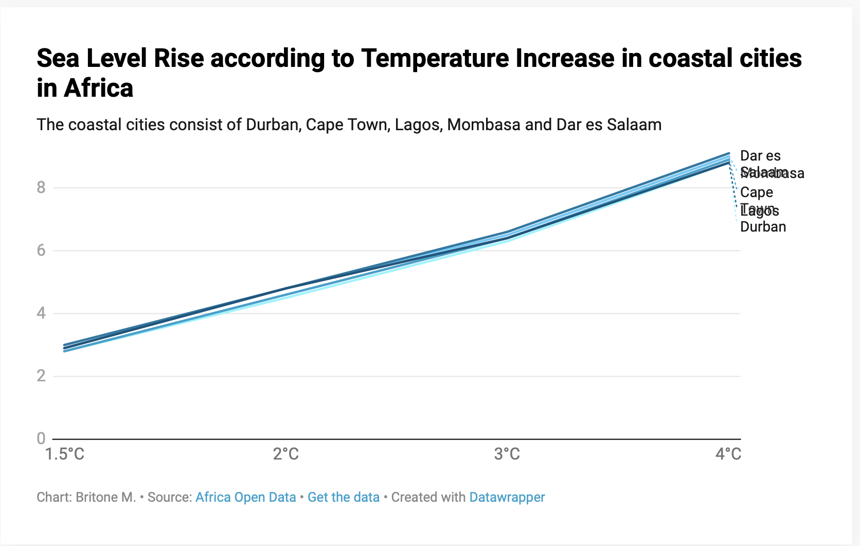 Found some data on sea level changes in relation to temperate increase in the coastal cities of Durban, Cape Town, Lagos, Mombasa and Dar es Salaam. I was able to create a visualization of this data as seen below.